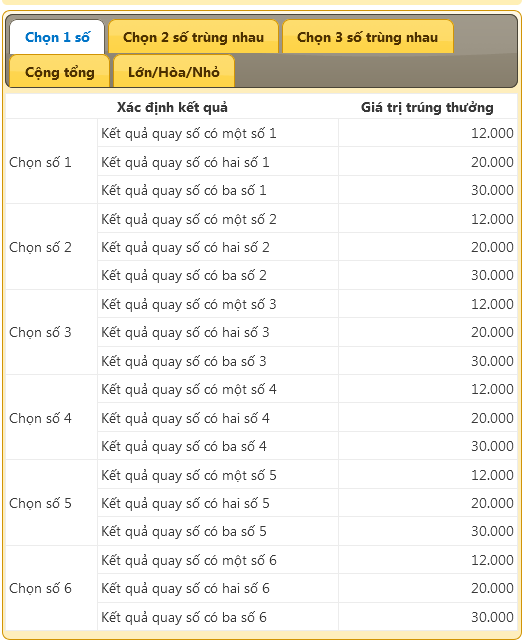 Người tham gia dự thưởng lựa chọn số tham gia dự thưởng trong tập hợp các số từ 1 đến 6 và so sánh với kết quả quay số mở thưởng để xác định giải thưởng. Kết quả một kỳ quay số mở thưởng bao gồm 03 số kết quả được quay số 03 lần để chọn ra. Các cách chơi cơ bản bao gồm