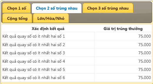 Người tham gia dự thưởng lựa chọn hai số tham gia dự thưởng trùng nhau: trùng hai số 1, trùng hai số 2, trùng hai số 3, trùng hai số 4, trùng hai số 5, trùng hai số 6.