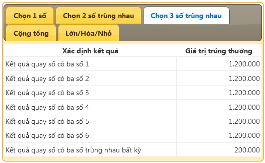Người tham gia dự thưởng lựa chọn ba số tham gia dự thưởng trùng nhau: trùng ba số 1, trùng ba số 2, trùng ba số 3, trùng ba số 4, trùng ba số 5, trùng ba số 6, trùng ba số bất kỳ.