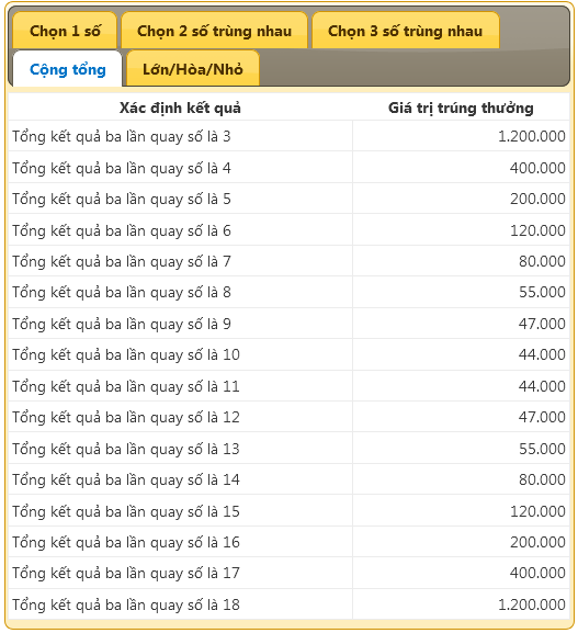 Người tham gia dự thưởng lựa chọn số tổng của 03 số kết quả quay số mở thưởng, tối thiểu là 3 và tối đa là 18 (16 cách chọn).